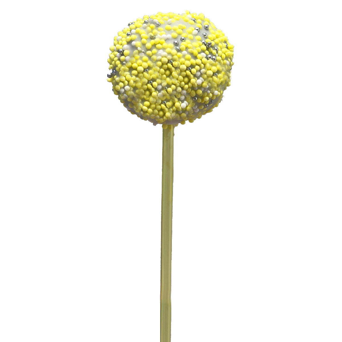 Μπουκίτσα κέικ βανίλιας με λευκή σοκολάτα πασπαλισμένη με χρωματιστή τρούφα στερεωμένη σε καλαμάκι.