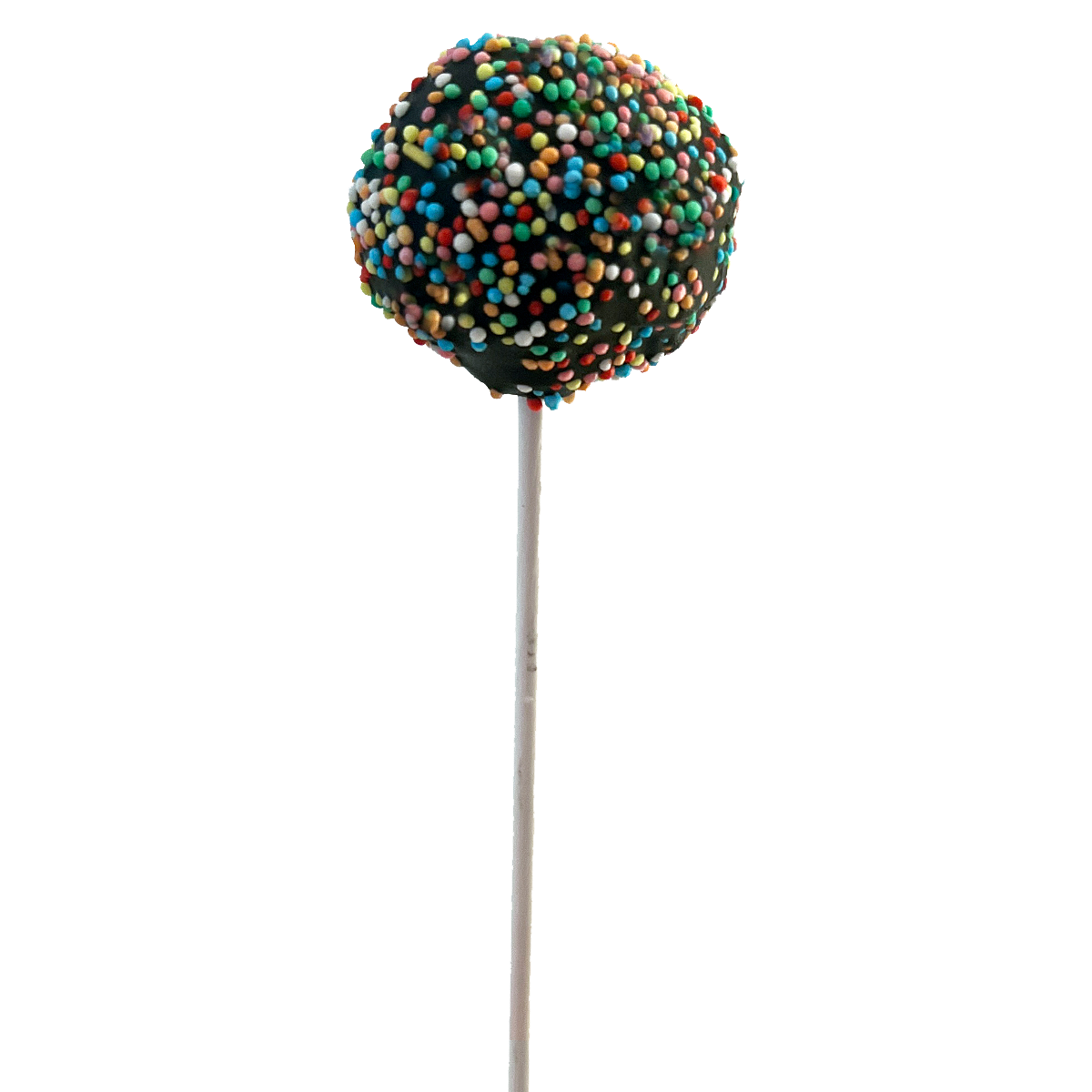 Μπουκίτσα κέικ σοκολάτας με μαύρη σοκολάτα πασπαλισμένη  με χρωματιστή τρούφα στερεωμένη σε καλαμάκι.